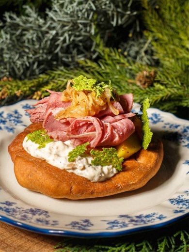 Конина холодного копчения на ржаной лепёшке с картофелем, печёным в костре.