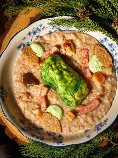 Голубец с утиными потрошками на ячневой каше с копчёной грудинкой и белыми грибами.