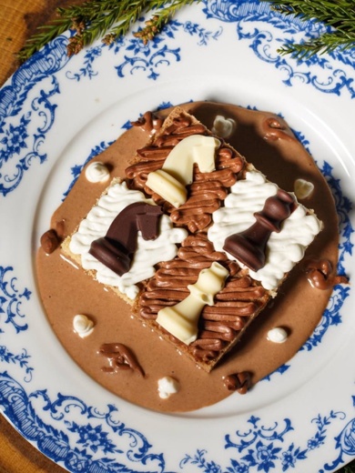 Молочный и шоколадный бисквит с кремом из топлёных сливок и конфетами из белых грибов и шоколада.